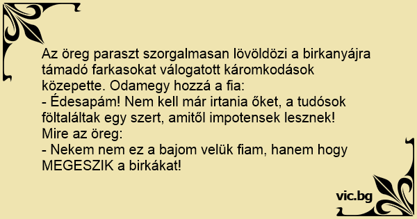 Az öreg paraszt szorgalmasan lövöldözi a birkanyájra támadó farkasokat válogatott káromkodások közepette. Odamegy hozzá a fia: