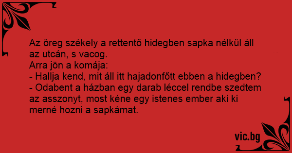 - Odabent a házban egy darab léccel rendbe szedtem az asszonyt, most kéne egy istenes ember aki ki merné hozni a sapkámat.