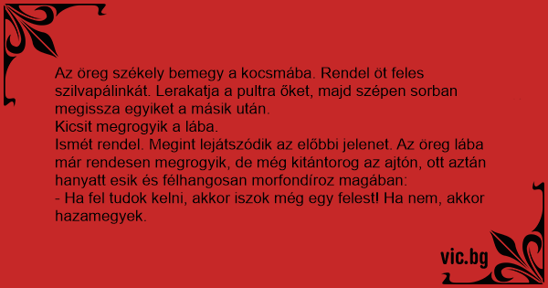 Az öreg székely bemegy a kocsmába. Rendel öt feles szilvapálinkát. Lerakatja a pultra őket, majd szépen sorban megissza egyiket a másik után.