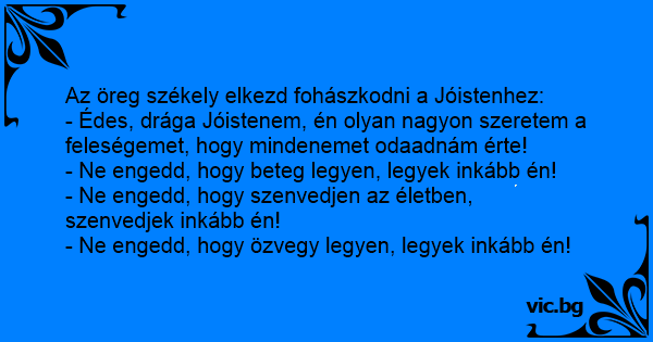 - Édes, drága Jóistenem, én olyan nagyon szeretem a feleségemet, hogy mindenemet odaadnám érte!