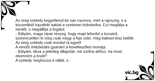 Az öreg székely kegyetlenül be van nyomva, mint a rajzszög, s a kocsmából hazafelé baktat a szekéren bóbiskolva. Ezt meglátja a rendőr, s megállítja a fogatot.