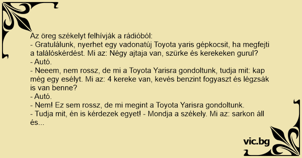 - Neeem, nem rossz, de mi a Toyota Yarisra gondoltunk, tudja mit: kap még egy esélyt. Mi az: 4 kereke van, kevés benzint fogyaszt és légzsák is van benne?