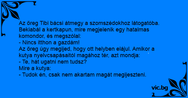 Az öreg Tibi bácsi átmegy a szomszédokhoz látogatóba. Bekiabál a kertkapun, mire megjelenik egy hatalmas komondor, és megszólal: