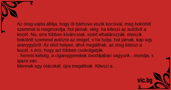 Az öreg vajda állítja, hogy őt bárhova viszik kocsival, még bekötött szemmel is megmondja, hol járnak, elég, ha kiteszi az autóból a kezét. Na, erre többen kíváncsiak, ezért elhatározzák, elviszik bekötött szemmel autózni az öreget, s ha tudja, hol járnak, kap egy aranygyűrűt. Az első helyen, ahol megállnak, az öreg kiteszi a kezét, s érzi, hogy azt többen csókolgatják.