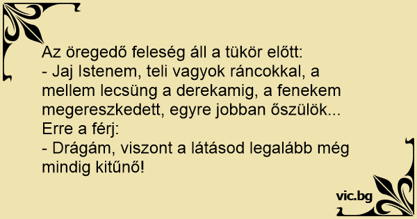 Kona står naken og ser seg selv i speilet. Hun sier til mannen: "Jeg er gammel, fet og stygg. Kan du ikke gi meg et kompliment?" Mannen: "Jo synet ditt er perfekt..."