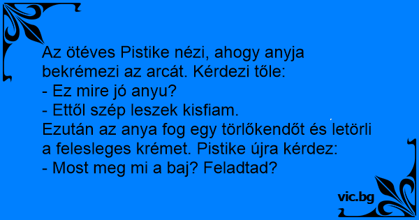 Az ötéves Pistike nézi, ahogy anyja bekrémezi az arcát. Kérdezi tőle: