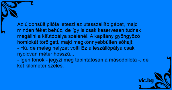 - Hű, de meleg helyzet volt! Ez a leszállópálya csak nyolcvan méter hosszú...