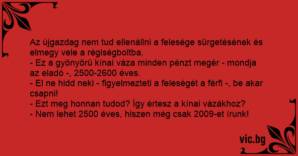 - Ez a gyönyörű kínai váza minden pénzt megér - mondja az eladó -, 2500-2600 éves.