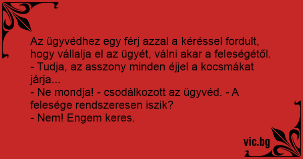 Az ügyvédhez egy férj azzal a kéréssel fordult, hogy vállalja el az ügyét, válni akar a feleségétől.