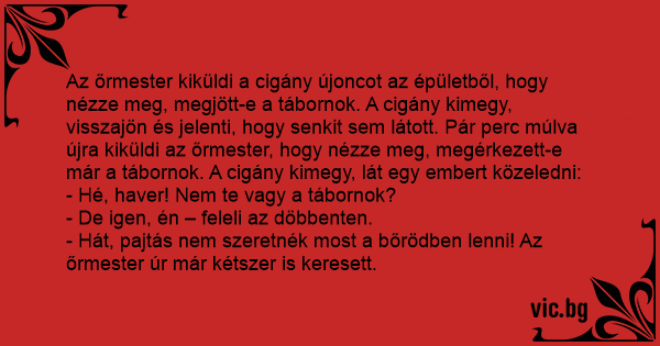 Az őrmester kiküldi a cigány újoncot az épületből, hogy nézze meg, megjött-e a tábornok. A cigány kimegy, visszajön és jelenti, hogy senkit sem látott. Pár perc múlva újra kiküldi az őrmester, hogy nézze meg, megérkezett-e már a tábornok. A cigány kimegy, lát egy embert közeledni: