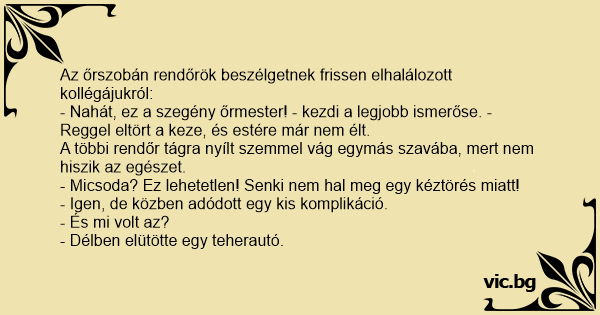 - Nahát, ez a szegény őrmester! - kezdi a legjobb ismerőse. - Reggel eltört a keze, és estére már nem élt.