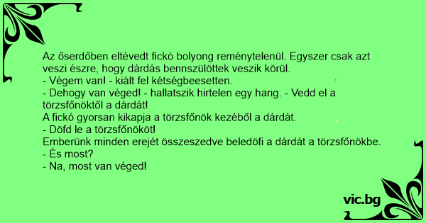 Az őserdőben eltévedt fickó bolyong reménytelenül. Egyszer csak azt veszi észre, hogy dárdás bennszülöttek veszik körül. - Végem van! - kiált fel kétségbeesetten. - Dehogy van véged! - hallatszik hirtelen egy hang. - Vedd el a törzsfőnöktől a dárdát! A fickó gyorsan kikapja a törzsfőnök kezéből a dárdát. - Döfd le a törzsfőnököt! Emberünk minden erejét összeszedve beledöfi a dárdát a törzsfőnökbe. - És most? - Na, most van véged!
