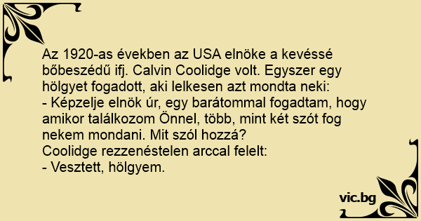 Az 1920-as években az USA elnöke a kevéssé bőbeszédű ifj. Calvin Coolidge volt. Egyszer egy hölgyet fogadott, aki lelkesen azt mondta neki: