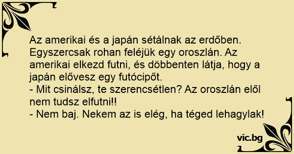 Az amerikai és a japán sétálnak az erdőben. Egyszercsak rohan feléjük egy oroszlán. Az amerikai elkezd futni, és döbbenten látja, hogy a japán elővesz egy futócipőt.