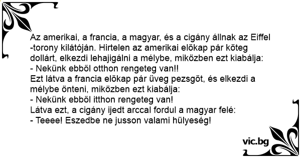 Az amerikai, a francia, a magyar, és a cigány állnak az Eiffel-torony kilátóján. Hirtelen az amerikai előkap pár köteg dollárt, elkezdi lehajigálni a mélybe, miközben ezt kiabálja: