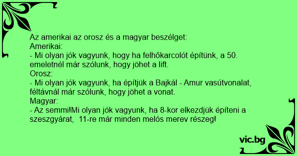 - Az semmi!Mi olyan jók vagyunk, ha 8-kor elkezdjük építeni a szeszgyárat, 11-re már minden melós merev részeg!