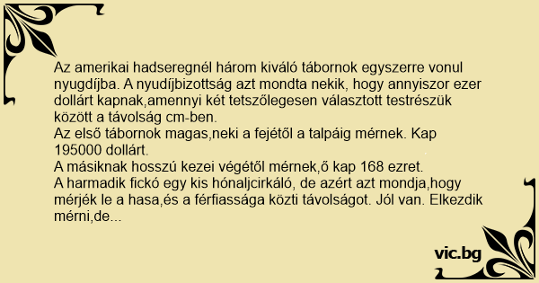 Az amerikai hadseregnél három kiváló tábornok egyszerre vonul nyugdíjba. A nyudíjbizottság azt mondta nekik, hogy annyiszor ezer dollárt kapnak,amennyi két tetszőlegesen választott testrészük között a távolság cm-ben.