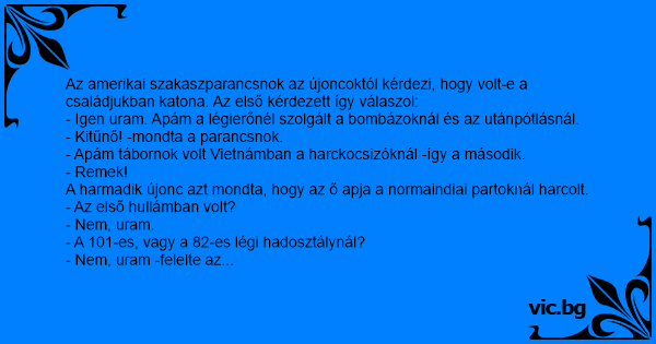 Az amerikai szakaszparancsnok az újoncoktól kérdezi, hogy volt-e a családjukban katona. Az első kérdezett így válaszol: