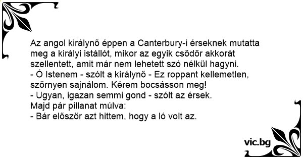 Az angol királynő éppen a Canterbury-i érseknek mutatta meg a királyi istállót, mikor az egyik csődör akkorát szellentett, amit már nem lehetett szó nélkül hagyni.