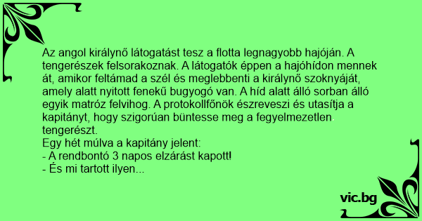 Az angol királynő látogatást tesz a flotta legnagyobb hajóján. A tengerészek felsorakoznak. A látogatók éppen a hajóhídon mennek át, amikor feltámad a szél és meglebbenti a királynő szoknyáját, amely alatt nyitott fenekű bugyogó van. A híd alatt álló sorban álló egyik matróz felvihog. A protokollfőnök észreveszi és utasítja a kapitányt, hogy szigorúan büntesse meg a fegyelmezetlen tengerészt.