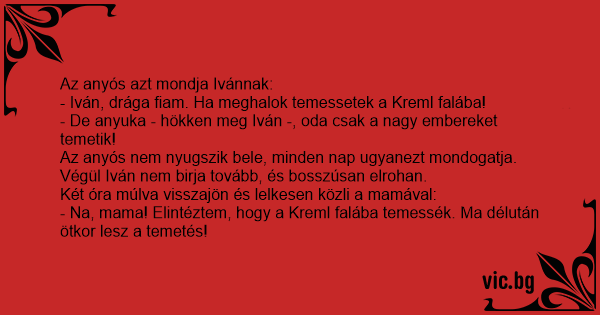 - Na, mama! Elintéztem, hogy a Kreml falába temessék. Ma délután ötkor lesz a temetés!