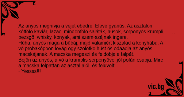 Bejön az anyós, a vő a krumplis serpenyővel jól pofán csapja. Mire a macska felpattan az asztal alól, és felüvölt: