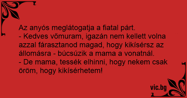 - Kedves vőmuram, igazán nem kellett volna azzal fárasztanod magad, hogy kikísérsz az állomásra - búcsúzik a mama a vonatnál.