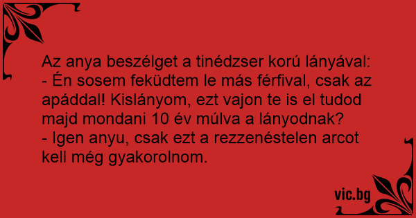 - Én sosem feküdtem le más férfival, csak az apáddal! Kislányom, ezt vajon te is el tudod majd mondani 10 év múlva a lányodnak?