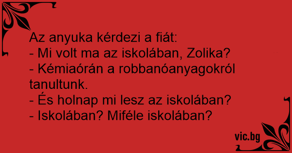 Tėvas klausia sūnaus: - Ką šiandien veikėte mokykloje? - Per chemiją studijavome sprogstamąsias medžiagas. - O ką rytoj veiksite mokykloje? - Kokioje mokykloje, tėveli…