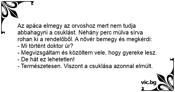 Az apáca elmegy az orvoshoz mert nem tudja abbahagyni a csuklást. Néhány perc múlva sírva rohan ki a rendelőből. A nővér bemegy és megkérdi: