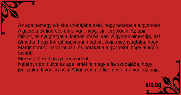 Az apa bemegy a kisfia szobájába este, hogy betakarja a gyereket. A gyereknek lidérces álma van, nyög, sír, forgolódik. Az apja felkölti, és nyugtatgatja, kérdezi mi baj van. A gyerek elmondja, azt álmodta, hogy Margit nagynéni meghalt. Apja megnyugtatja, hogy Margit néni teljesen jól van, és betakarja a gyereket, hogy aludjon tovább.
