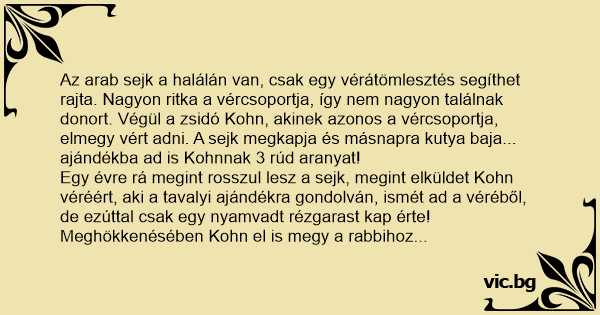 Az arab sejk a halálán van, csak egy vérátömlesztés segíthet rajta. Nagyon ritka a vércsoportja, így nem nagyon találnak donort. Végül a zsidó Kohn, akinek azonos a vércsoportja, elmegy vért adni. A sejk megkapja és másnapra kutya baja... ajándékba ad is Kohnnak 3 rúd aranyat!