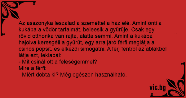 Az asszonyka leszalad a szeméttel a ház elé. Amint önti a kukába a vödör tartalmát, beleesik a gyűrűje. Csak egy rövid otthonka van rajta, alatta semmi. Amint a kukába hajolva keresgéli a gyűrűt, egy arra járó férfi meglátja a csinos popsit, és elkezdi simogatni. A férj fentről az ablakból látja ezt, lekiabál: