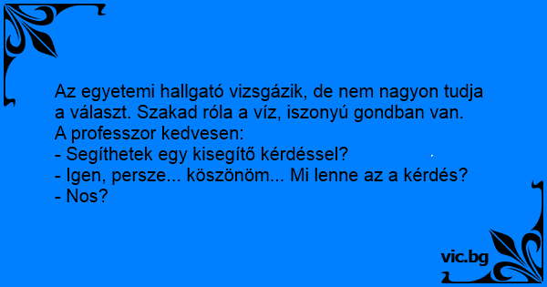 Az egyetemi hallgató vizsgázik, de nem nagyon tudja a választ. Szakad róla a víz, iszonyú gondban van.
