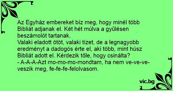 Valaki eladott ötöt, valaki tízet, de a legnagyobb eredményt a dadogós érte el, aki több, mint húsz Bibliát adott el. Kérdezik tőle, hogy csinálta?