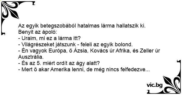 - Én vagyok Európa, ő Ázsia, Kovács úr Afrika, és Zeller úr Ausztrália.