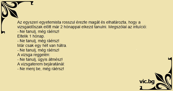 Az egyszeri egyetemista rosszul érezte magát és elhatározta, hogy a vizsgaidőszak előtt már 2 hónappal elkezd tanulni. Megszólal az intuíció: