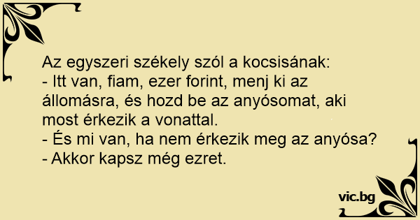- Itt van, fiam, ezer forint, menj ki az állomásra, és hozd be az anyósomat, aki most érkezik a vonattal.