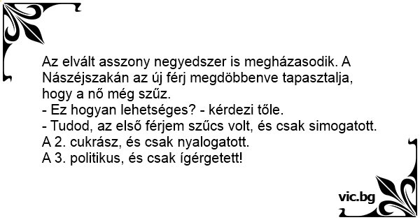 - Tudod, az első férjem szűcs volt, és csak simogatott. A 2. cukrász, és csak nyalogatott.