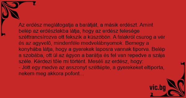 Az erdész meglátogatja a barátját, a másik erdészt. Amint belép az erdészlakba látja, hogy az erdész felesége széttrancsírozva ott fekszik a küszöbön. A falakról csurog a vér és az agyvelő, mindenféle medvelábnyomok. Bemegy a konyhába látja, hogy a gyerekek laposra vannak tiporva. Belép a szobába, ott ül az ágyon a barátja és fel van repedve a szája széle. Kérdezi tőle mi történt. Meséli az erdész, hogy: