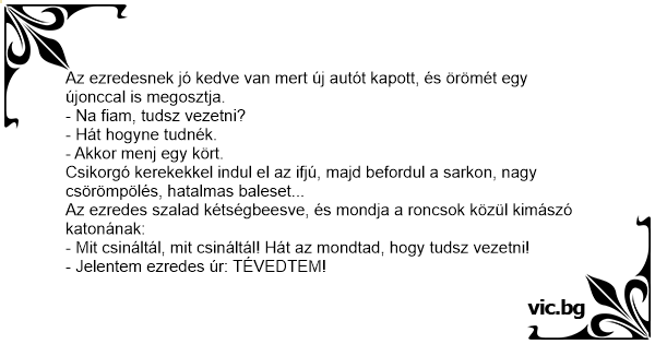 Az ezredesnek jó kedve van mert új autót kapott, és örömét egy újonccal is megosztja.