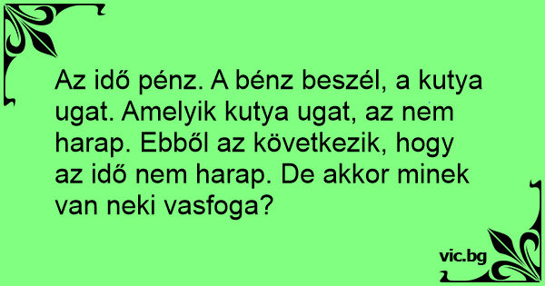 Az idő pénz. A bénz beszél, a kutya ugat. Amelyik kutya ugat, az nem harap. Ebből az következik, hogy az idő nem harap. De akkor minek van neki vasfoga?