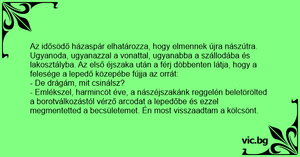 - Emlékszel, harmincöt éve, a nászéjszakánk reggelén beletörölted a borotválkozástól vérző arcodat a lepedőbe és ezzel megmentetted a becsületemet. Én most visszaadtam a kölcsönt.