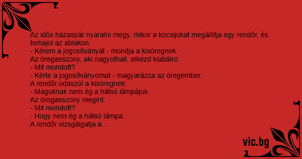 Az idős házaspár nyaralni megy, mikor a kocsijukat megállítja egy rendőr, és behajol az ablakon: