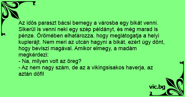 Az idős paraszt bácsi bemegy a városba egy bikát venni. Sikerül is venni neki egy szép példányt, és még marad is pénze. Örömében elhatározza, hogy meglátogatja a helyi kuplerájt. Nem meri az utcán hagyni a bikát, ezért úgy dönt, hogy beviszi magával. Amikor elmegy, a madám megkérdezi: