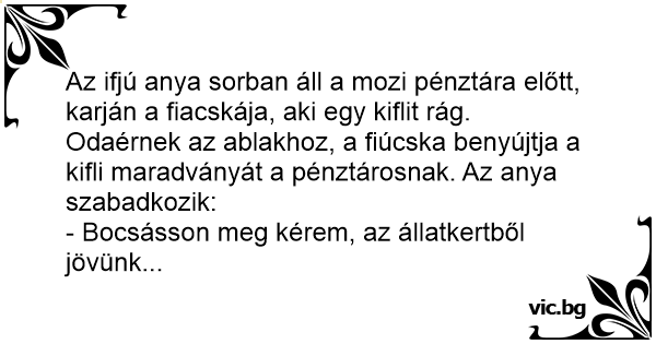 Az ifjú anya sorban áll a mozi pénztára előtt, karján a fiacskája, aki egy kiflit rág. Odaérnek az ablakhoz, a fiúcska benyújtja a kifli maradványát a pénztárosnak. Az anya szabadkozik: