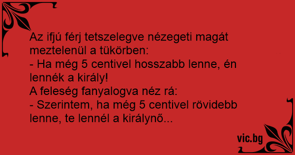 Nászéjszaka utáni reggelen az ifjú férj büszkén áll a nagy tükör előtt : - Ha 5 centivel hosszabb lenne, én lennék a király ! Felesége visszaszól: - Ha 5 centivel rövidebb lenne, te lennél a...