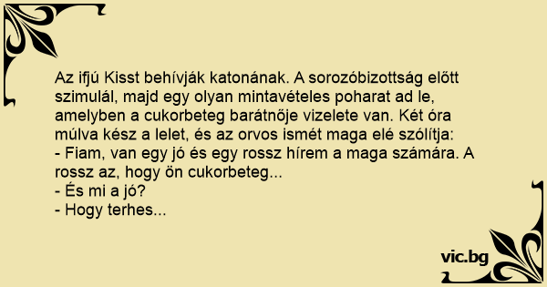 Az ifjú Kisst behívják katonának. A sorozóbizottság előtt szimulál, majd egy olyan mintavételes poharat ad le, amelyben a cukorbeteg barátnője vizelete van. Két óra múlva kész a lelet, és az orvos ismét maga elé szólítja: