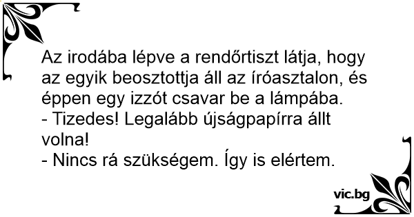 Az irodába lépve a rendőrtiszt látja, hogy az egyik beosztottja áll az íróasztalon, és éppen egy izzót csavar be a lámpába.
