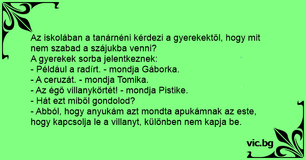 Az iskolában a tanárnéni kérdezi a gyerekektől, hogy mit nem szabad a szájukba venni?